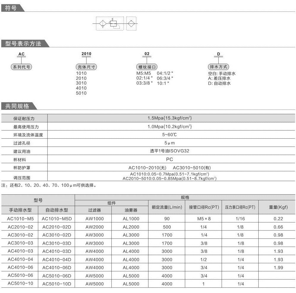 SMC型AC二聯(lián)件自動排水空氣過濾調(diào)壓氣源處理器AC2010-02 AC3010-03 AC4010-06 AC5010-10